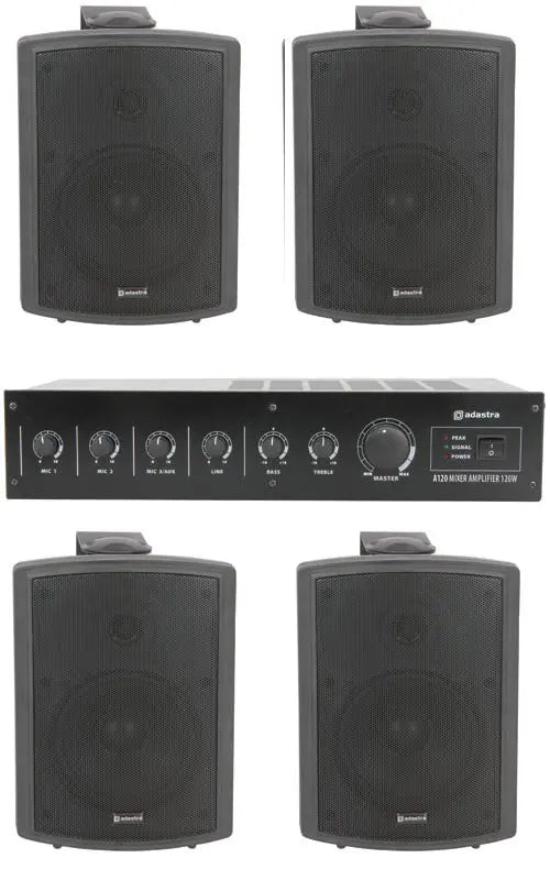 This easy to install complete 100v Line background music PA system ideal for bars restaurants waiting rooms etc... This sytem comes complete with a 4 channel 120W Mixer Amplifier and 4 x indooroutdoor wallmount speakers which are available in black and white. Total power output: 120W
