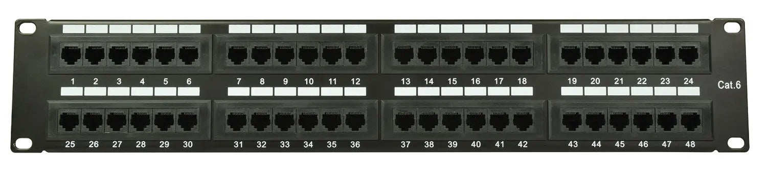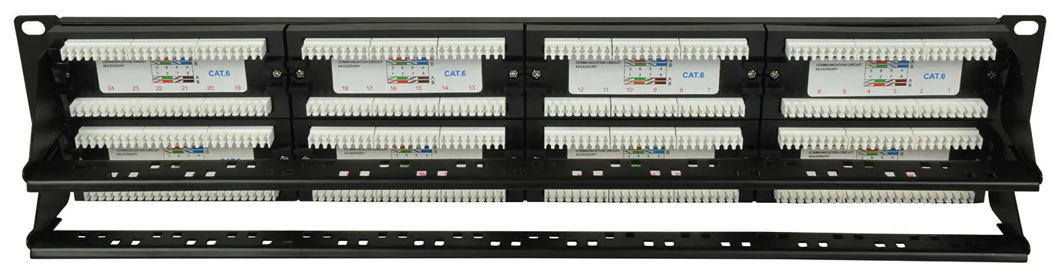 19" rackmount patch panels for networking over CAT5, CAT5e or CAT6 cabling with 24 or 48 x RJ45 (8P8C) sockets connected via rear mounted IDC panels. Each block of 6 sockets can be removed for easier handling during connection and cable management bars are supplied with cable ties for neat and secure installation.Cable management bars with punched tie-down points