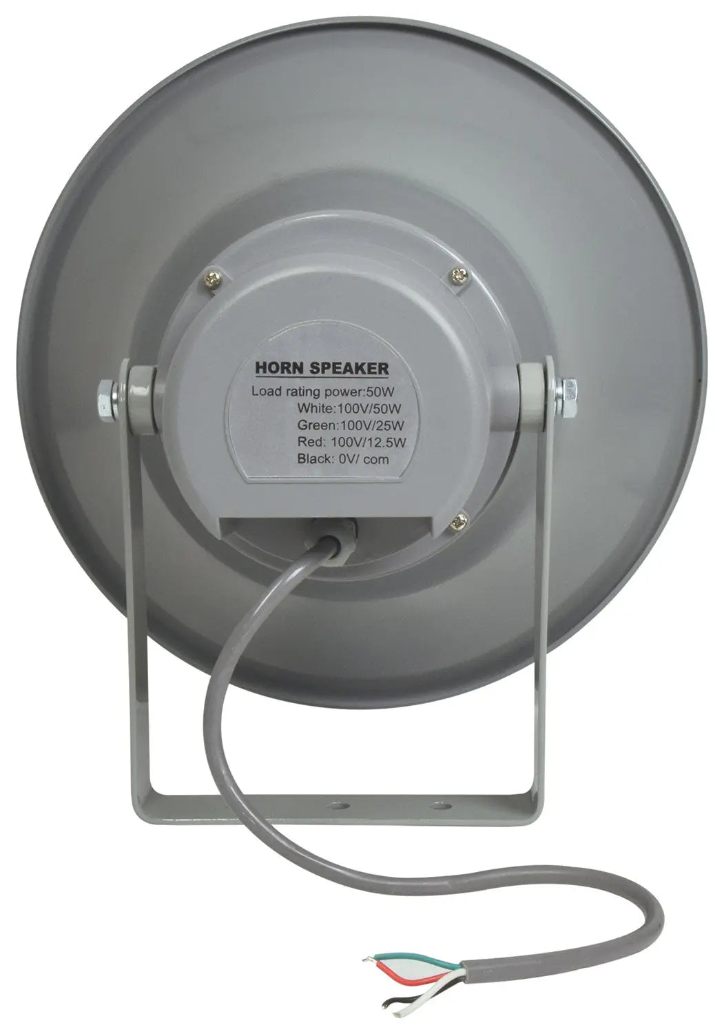 Heavy duty round horn speakers for voice alerts and public address in outdoor or indoor areas. Constructed from a spun aluminium flare with a weatherproof ABS rear cover and reflex cone. The fibreglass compression driver is connected to a 100V transformer with a 4-core cable offering 3 different power tappings. Tested to withstand the harshest elemental conditions and suitable for industrial installations, these horns offer reliable and consistent performance in almost any environment.Tested to extreme temperatures (-55°C to +70°C)