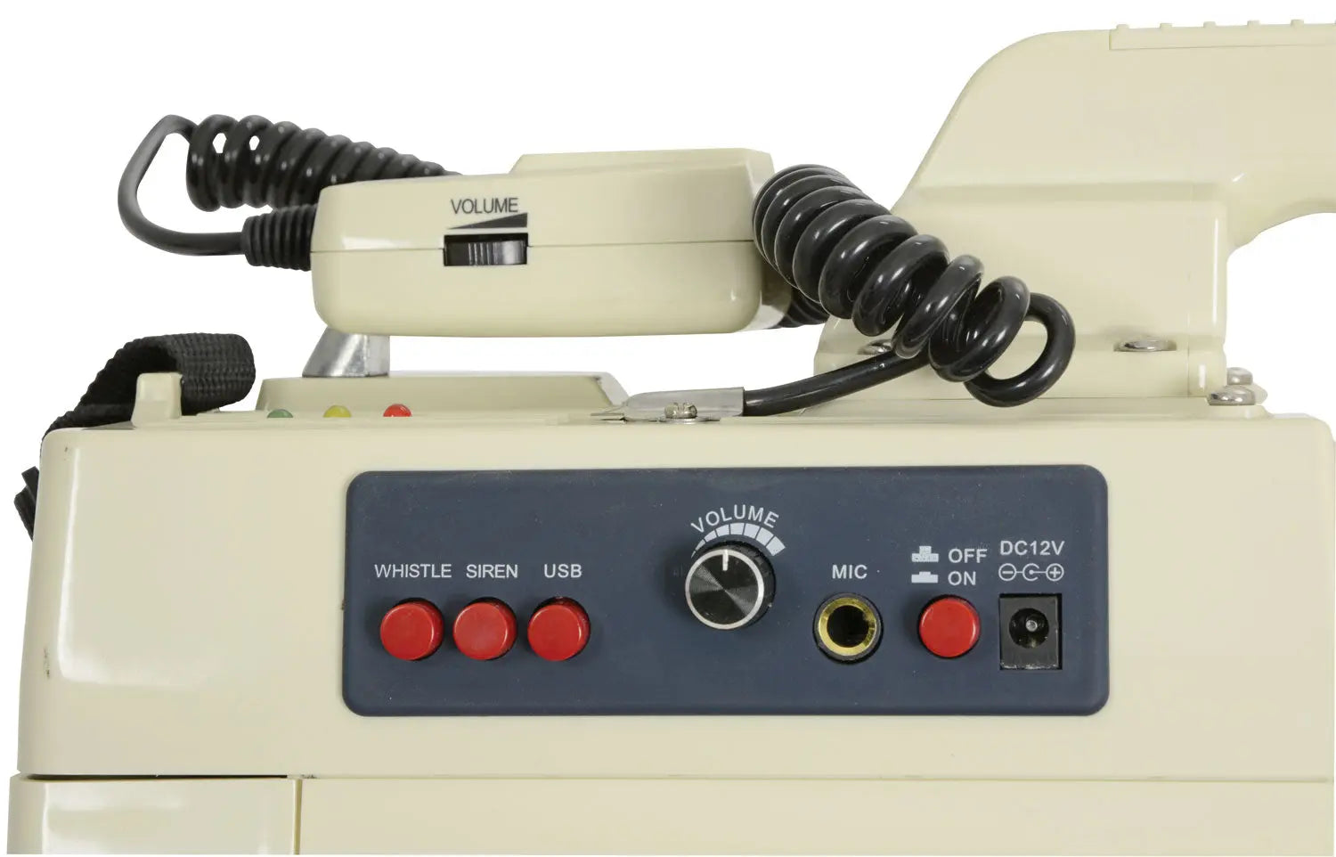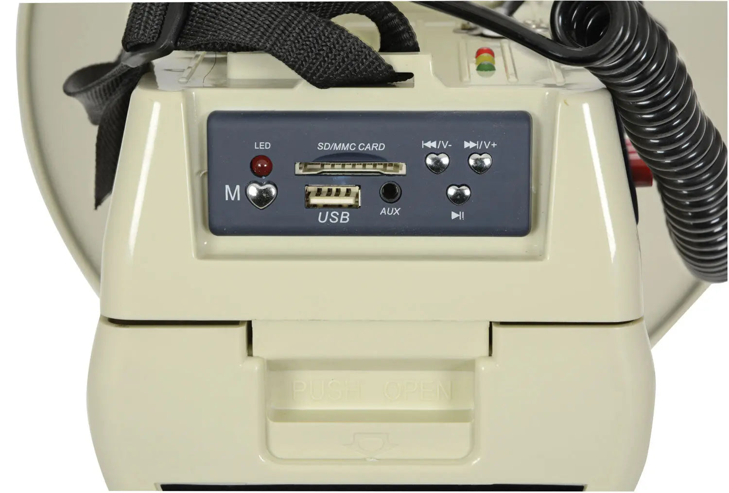 A large 50Wmax megaphone with 340mm spun aluminium flare and carrying handle. Can be operated free standing on rear legs or shoulder slung with the included strap. Alternatively, the megaphone can be mounted onto a stand via an 8mm threaded socket in the top of the flare. The rear panel is home to a USB/SD player with 3.5mm aux input and a latched cover for the battery compartment. 3 latching buttons control on/off, USB/SD and siren buttons and a non-latching button controls the whistle, all governed by a rotary volume control. A hard-wired clip microphone is provided with talk button and volume control or alternatively, a separate microphone can be connected to the 6.3mm mic. input. The most important feature is the power output, which can project sound as far as 1.5km, making this a serious product for announcements, event management and crowd control.Requires 10 x D batteries (not supplied) or 12Vdc power