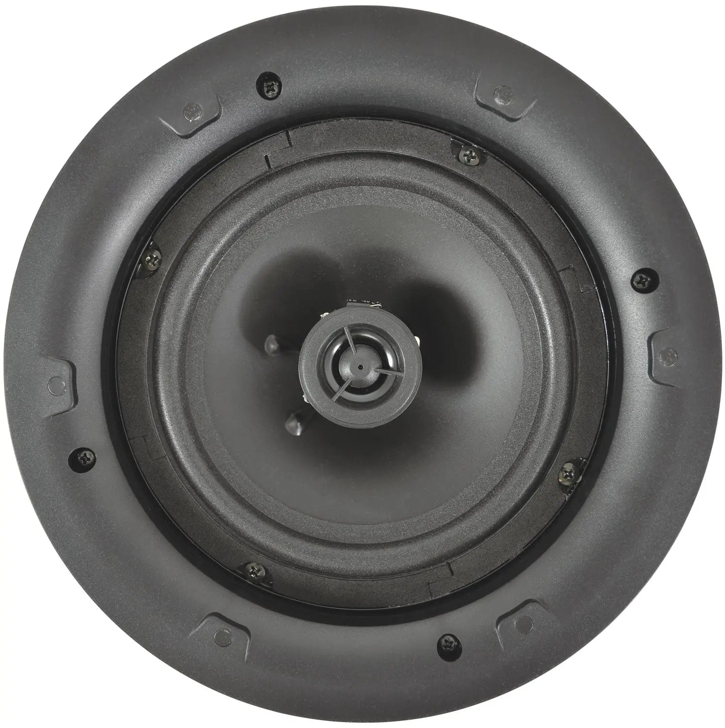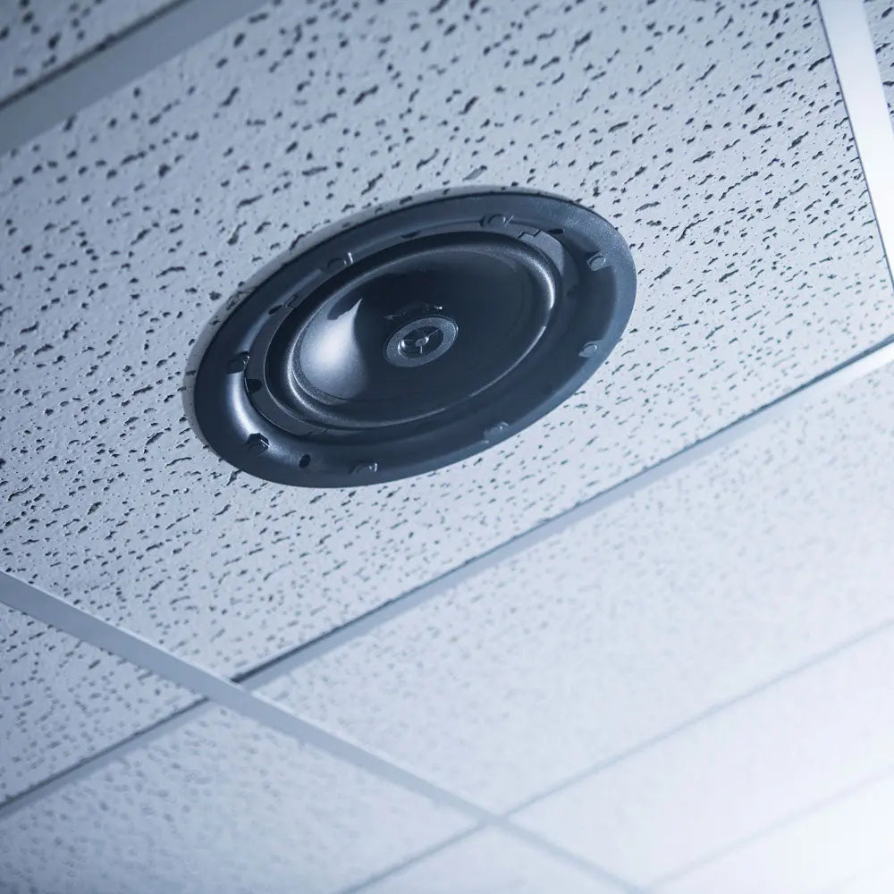 2-way ceiling speakers with flared baffle and a low profile magnetic grille. The main driver with concentric directional tweeter is operated via a rotary control with 5 x 100V volume tappings and an 8 Ohms option. Mount into suspended or false ceilings using the 4 "dog-ear" mounts to achieve a discreet, high quality sound installation.Magnetic frameless grille