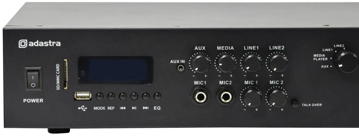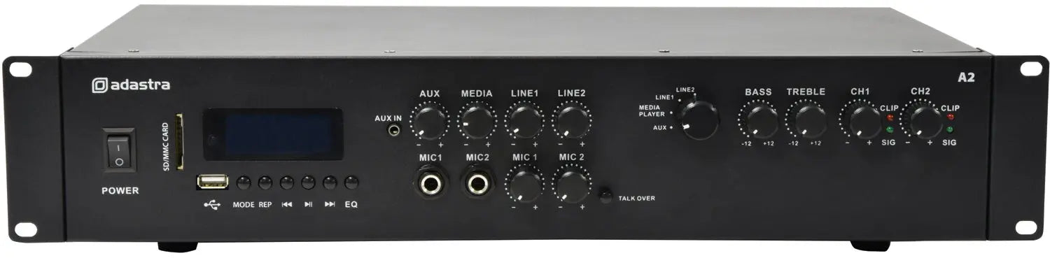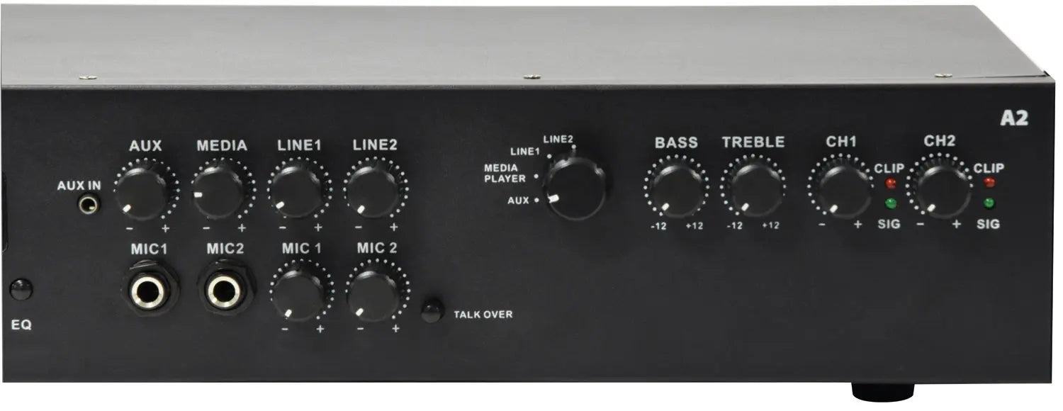 Fully featured stereo amplifier with mixer section for 2 microphones and a stereo audio source. An inbuilt media player section offers playback of mp3 audio tracks from USB drive or SD card and also has a Bluetooth receiver and FM radio tuner. A rotary switch selects between 2 rear stereo inputs, a front 3.5mm stereo input or the built-in media player. Speaker connections on the rear panel are via 4mm binding posts, which can drive up to 2 x 8 Ohm speakers per channel to deliver 2 x 200W. Designed to offer installers a flexible solution for P.A. and music playback in bars, restaurants and function rooms.Media player with USB/SD playback