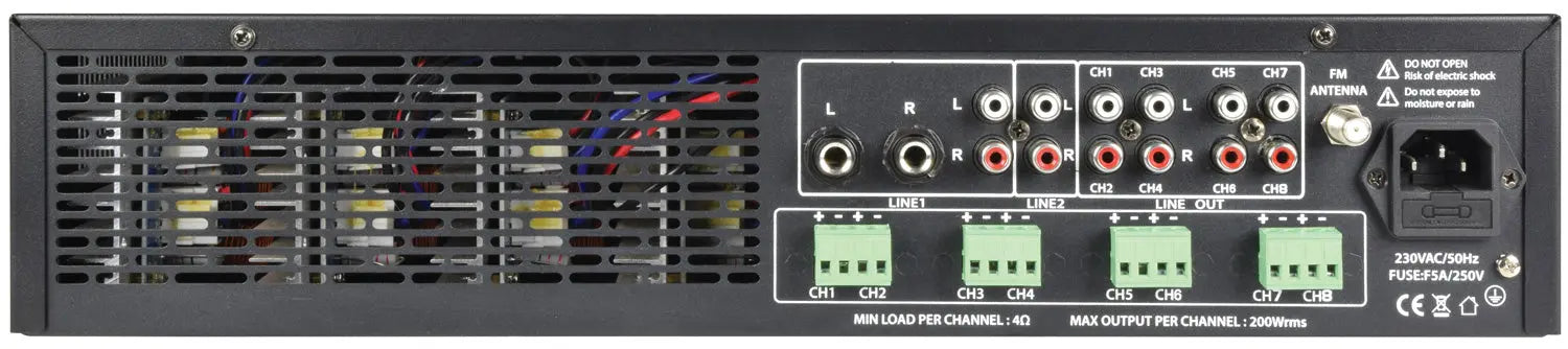 Multi-zone amplifiers with 2 microphone inputs and a switchable stereo input for each zone. An inbuilt media player section offers playback of mp3 audio tracks from USB drive or SD card and also has a B/T wireless receiver and FM radio tuner. A rotary switch for each output zone selects the stereo playback audio from a choice of 2 rear stereo inputs, a front 3.5mm stereo input or the built-in media player. Mic inputs 1 and 2 are live to all output zones at all times. Speakers are connected from the rear panel Euroblock terminals to deliver up to 200W per output at 4 Ohms. Designed for installations requiring high quality stereo sound in multiple rooms or listening areas.Available with 3 or 4 independent stereo outputs