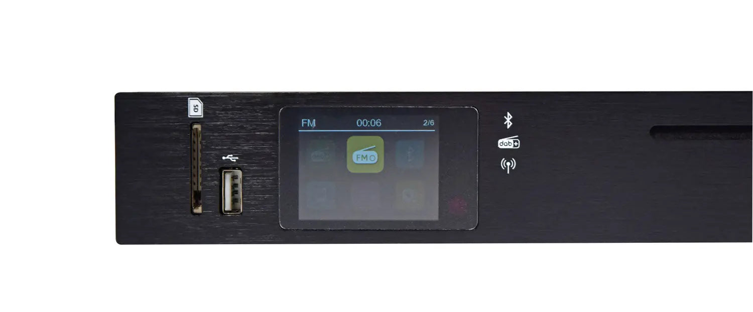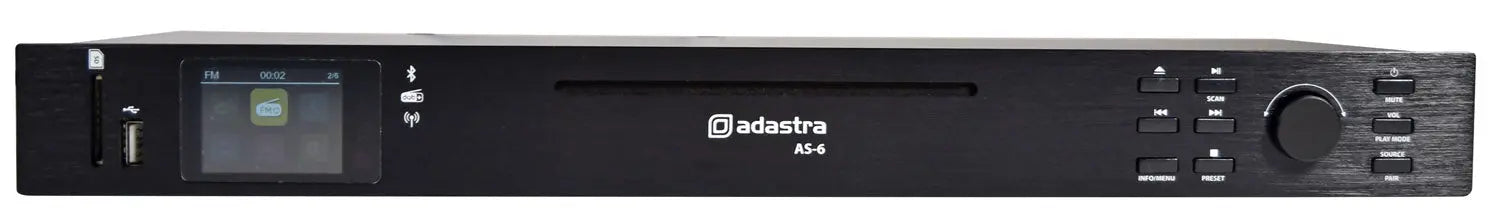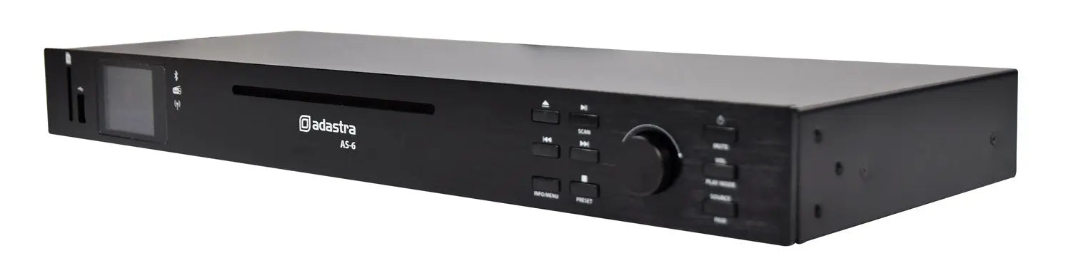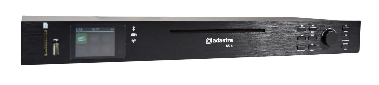 1U rack-mountable audio source with 6 different playback modes all in a single, compact unit. The clean and minimalist front panel is home to a full colour TFT display, which shows mode and settings information (including a clock in standby mode). Controls on the right side of the front panel operate the menus and playback, along with the included remote control handset. Modes include a slot-feed CD player, USB player, SD card player, FM tuner, DAB/DAB+ tuner and Bluetooth® receiver. A compact magnetic spring antenna is provided for FM and DAB+ reception which connects to an F socket on the AS-6 rear panel, or alternatively connect this socket to a roof mounted aerial for best possible reception. A comprehensive solution for playback in any sound system installation requiring background music and other continuous program material.Slot-feed CD player