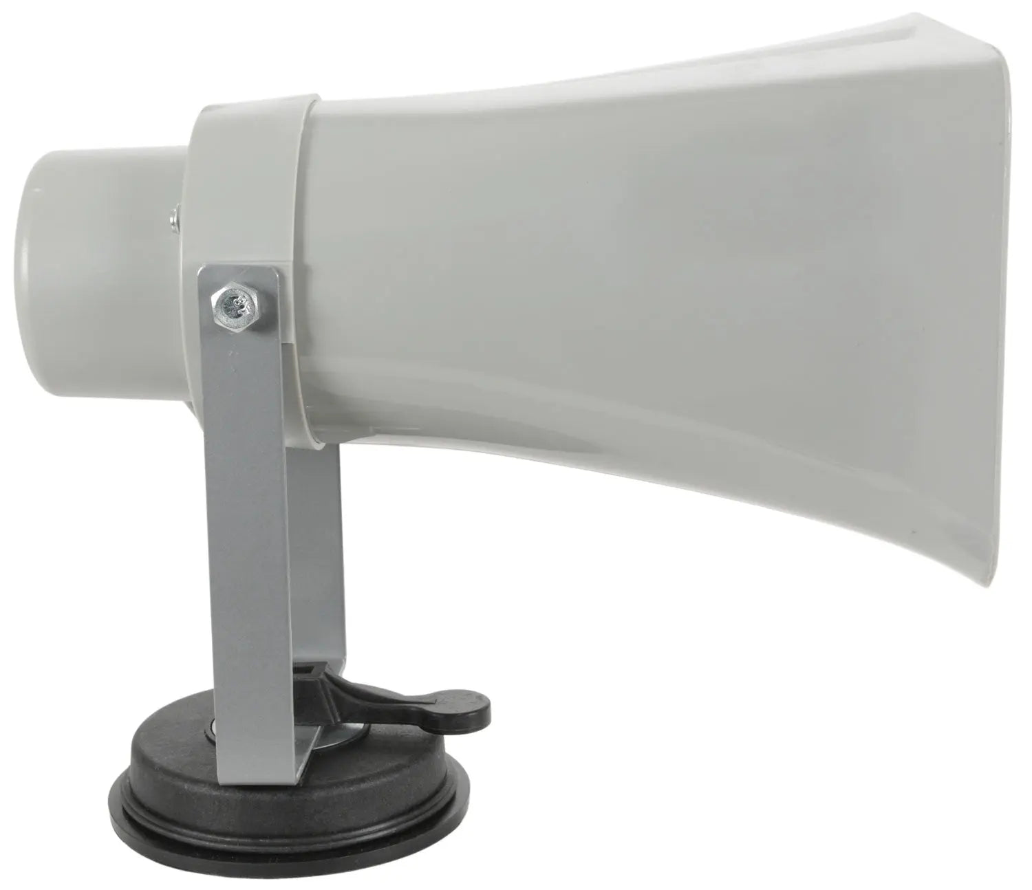 Active horn speaker with adjustable bracket and removable suction cup base for attaching to a vehicle roof. Power is connected via a 12V cigar lighter lead, delivering up to 25W power output. A detachable handset houses a microphone along with all controls and connectors for other functions. The top of the handset has ports for USB and SD media to allow audio playback and a 3.5mm auxiliary line input for external audio sources. An integral record function enables a speech message to be recorded up to 120 seconds and played back as a loop. Siren and whistle alerts can be activated by push buttons and, an inbuilt Bluetooth receiver enables wireless connection to a smart phone for playback of audio files or as a remote microphone via various available Bluetooth Microphone apps. Designed for mobile announcements or permanent installation for public address or alerts.Integral Bluetooth receiver