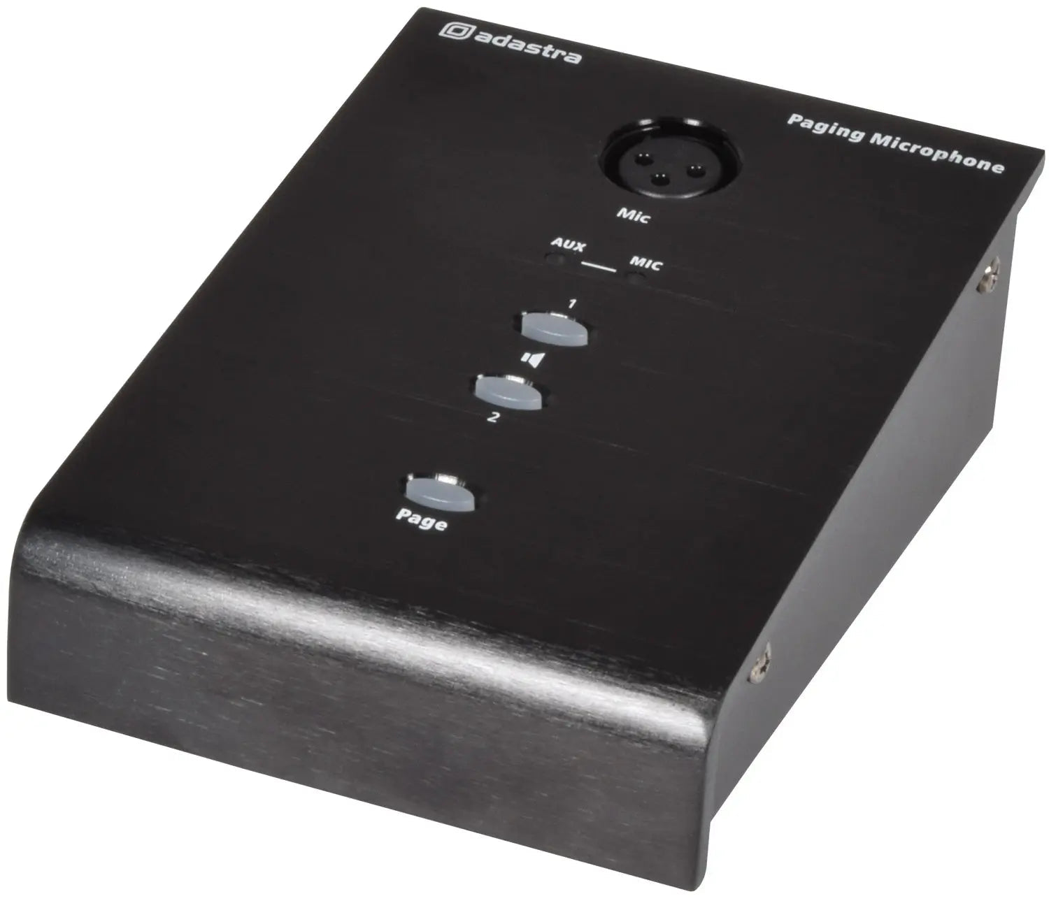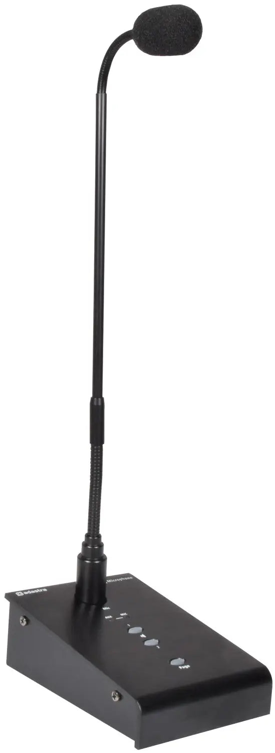 Desktop paging station with gooseneck microphone mounted via XLR into a base unit with a built-in dual amplifier. Each amplifier output has screw terminal speaker connections and can power a single 8 Ohm speaker or two 8 Ohm speakers wired in parallel (4 Ohm minimum load each output) and can be operated as a stereo Left + Right amplifier or as 2 separate zones. An AUX input on 3.5mm jack can accept a stereo line input for background music with its own volume control and is present on both channels permanently. A separate volume control governs the microphone level and there is a pre-set override that temporarily mutes the AUX input when announcements are being made. The paging process involves selecting one or both output channels via the buttons on the top panel and then pressing the "Page" button, which gives the option of paging just a single area or all areas where the speakers are installed. A simple and easy-to-use solution for where space is limited or an uncomplicated paging system is required.Independent volume controls for AUX and MIC