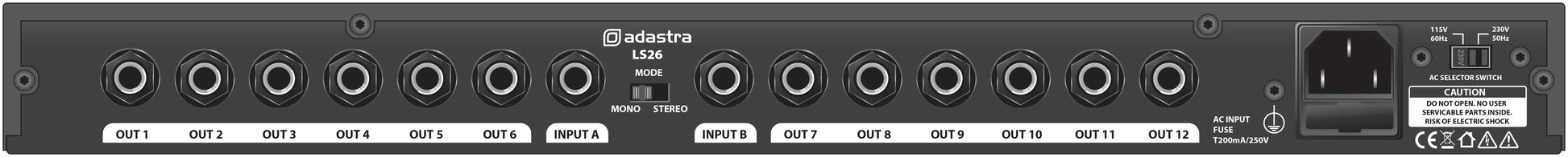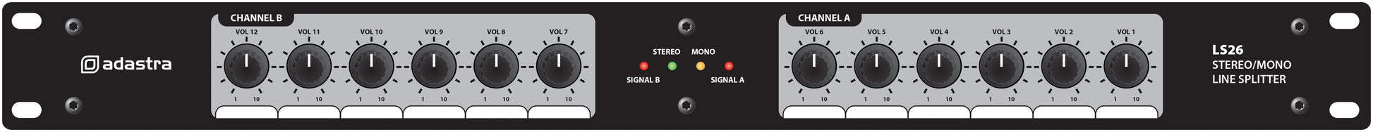 Signal splitter with 2 line inputs which are buffered and divided across 6 outputs each. Can be used as a 6-way stereo splitter or can be switched as a mono system feeding all 12 outputs from input A. Applications include zone mixing personal monitoring effects patching and routing in complex recording setups. Up to 12 outputs from 1 or 2 inputs Individual volume control for each output Input peak LEDs