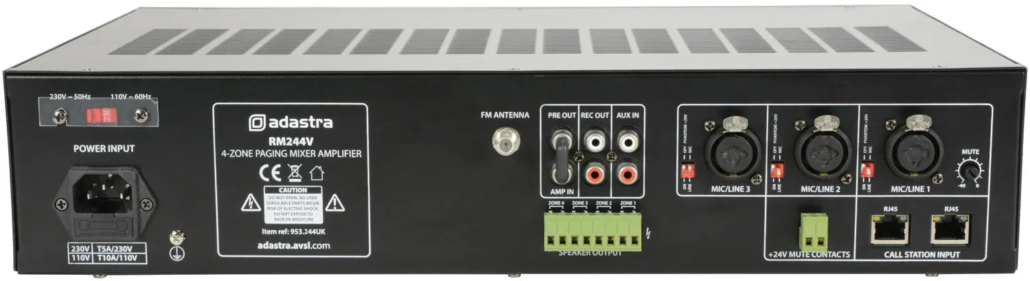 240W mixer-amplifier with 3 mic/line inputs, 1 aux input and a built-in media player. Connections for mic/line inputs are jack or XLR and channel 1 input has a variable mute for priority override. 24V contacts can be connected to a fire alarm panel for emergency evacuation if required. The media section can provide playback from Bluetooth, USB/SD media or an FM tuner. Output terminals are provided for 4 zones which share the output of the 240W amplifier, governed by 4 individual rotary volume switches on the front panel. RJ45 inputs on the rear panel allow connection for up to two CS4 call stations to enable paging to individual or all zones. The RM244V offers versatile 4-zone control without the expense of a quad amplifier and can even be operated as the front end to an expanded public address system.Built-in USB/SD player with Bluetooth and FM tuner