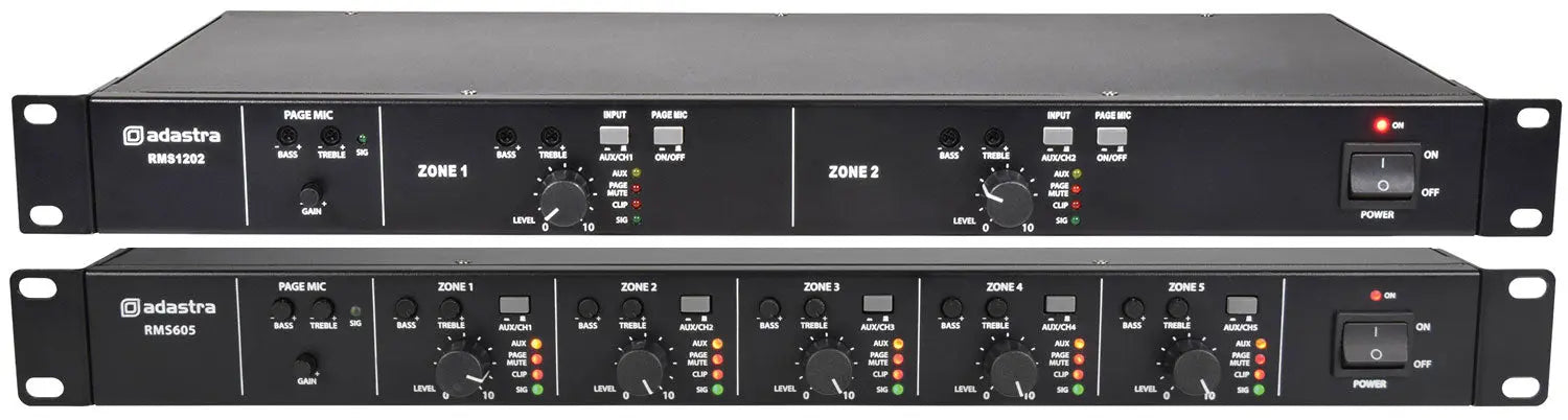 Multi-channel 100V slave amplifier with independent outputs for 100V or 4-16 Ohm speakers. Each amplifier channel has its own independent line input, which can be switched to a global auxiliary, providing the option of the same input to several of the amplifier channels if required. A paging microphone input is provided for voice alerts and a 24V mute terminal can be connected to an alarm panel for emergency evacuation override. Class D circuit design and efficient toroidal transformers have enabled a design which fits into a 1U rack-mount housing. The RMS-series amplifiers can be applied as high power slave units or equally as a fully independent zoning system for a multi-room installation.Outputs for 100V or 4-16 Ohm speakers