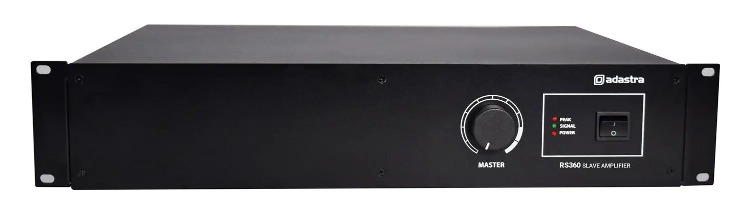 High power class-D 100V line slave amplifiers in a rack-mountable housing. Slave inputs accept standard line level audio from a mixer or RM series mixer amplifier. Slave outputs can be cascaded onto further RS slaves to build larger systems. All line level inputs are connectable via RCA sockets or hard-wired via removable screw terminals. A further removable screw terminal is provided for 100V input, which enables the RS series slave amplifier to extend an existing 100V installation by connecting directly to the 100V speaker feed, or indeed from a long distance 100V feed using standard double-insulated cable. A 24V terminal is provided for connection to a security or alert panel to mute the output if required during alarm triggering. Speaker outputs are either 100V or low impedance (switchable on RS121 and RS241) which is stable down to 2 Ohms, enabling multiple low impedance speakers to be connected if preferred. Designed to power medium to large installations from a mixer output or to expand existing systems.19" Rack-mountable 1U (120W, 240W) or 2U (360W, 480W)