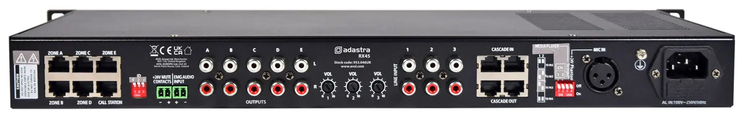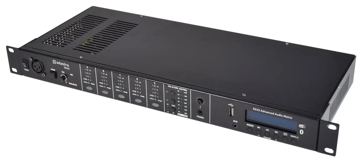 RX45 is a 1U rack-mountable audio matrix feeding 4 selectable inputs to 5 stereo outputs. An inbuilt audio player section features playback from USB media, DAB+ tuner or Bluetooth. Each zone output has a push button and LED ladder on the front panel for selecting the input source and adjusting level and tone settings in the master section. Connecting optional TR86 wall plates via CAT5 cable enables remote source and level selection for any zone. The output for the selected zone may be monitored through a headphones output on the front panel. The RX45 system is expandable using multiple RX45 units cascaded together via dual CAT5 links, with DIP switches to assign one of 8 different IDs to each connected RX45 unit, providing up to 40 distinct zones. Additional DIP switches can be set to link the audio player from one unit to one or more connected slaves.Expandable up to 40 individual zones (8 x RX45)