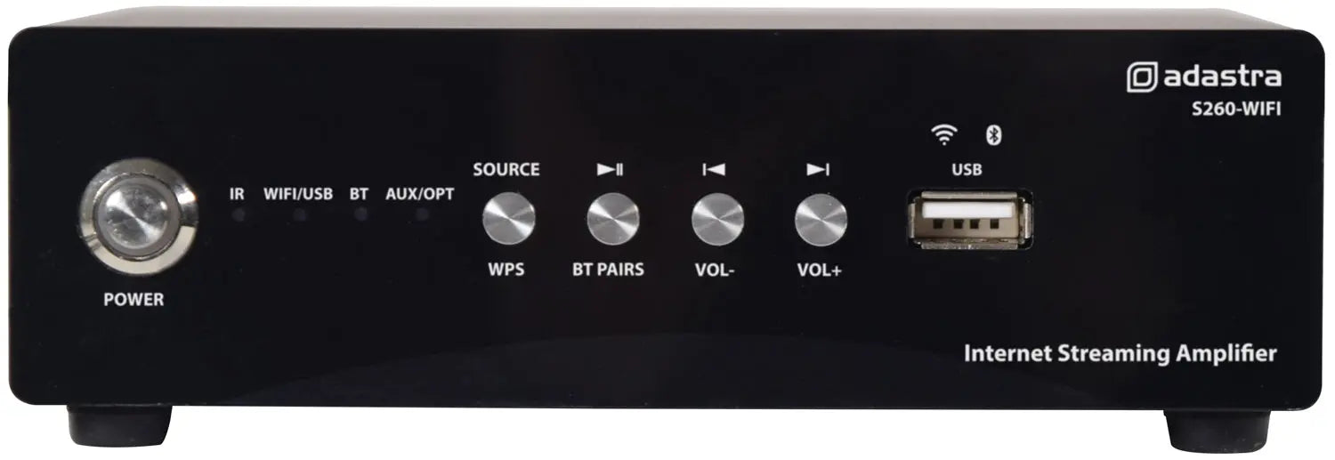 Class-D miniature amplifier delivering up to 2 x 60W output with Bluetooth and WiFi streaming capability. Controlled from an Android or iOS smart phone, the S260-WIFI is compatible with freely available apps to stream music and podcasts directly from a WiFi network. Embedded internet radio offers high quality digital audio from almost any online radio station or podcast available worldwide. Subscription services can store online playlists which can be cast directly from the internet without requiring the smart phone to be connected to the network. Wireless streaming of tracks and playlists stored on the smart phone can be sent from within the app or directly via Bluetooth to the amplifier. A line input is selectable for connection to a TV, CD, DVD or other playback device if required. In addition, the S260-WIFI has inputs for USB for playback of stored tracks. This neat unit provides a versatile "hands off" background music solution for continuous playback of music from internet services or a choice of other sources for bars, cafes, restaurants, reception areas and house parties.2 x 60W class-D amplifier