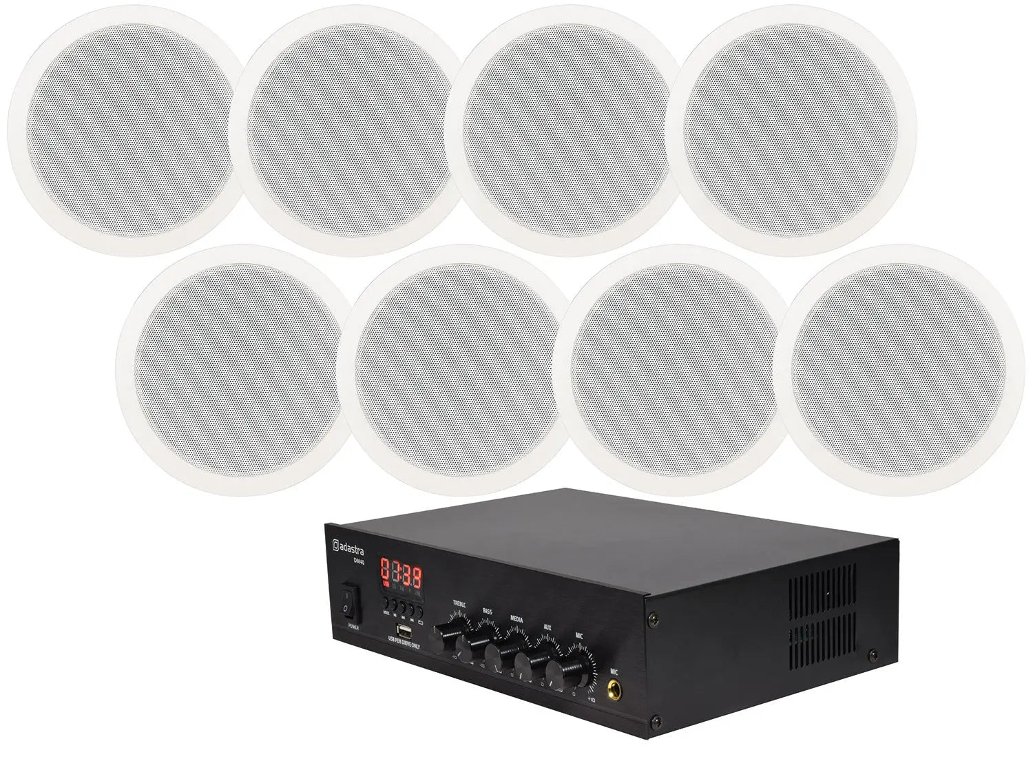 Our black ceiling speakers are a superb solution when you want your audio to stand out from the crowd. This pack is ideal for smaller rooms and spaces where black speakers fit the surroundings.Amplifier and speakers packed separately