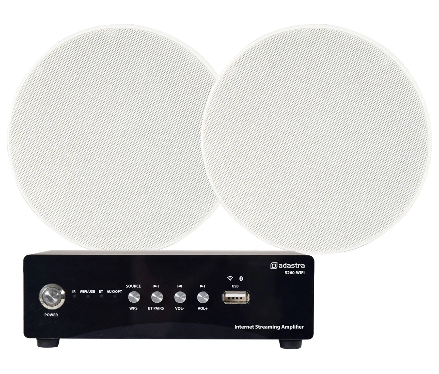 Want wireless audio streaming options? Control your ceiling speakers from an Android or iOS smart phone with freely available apps to stream music and podcasts directly from a WiFi network. This solution is ideal for smaller rooms, apartments, and small eateries.Amplifier and speakers packed separately