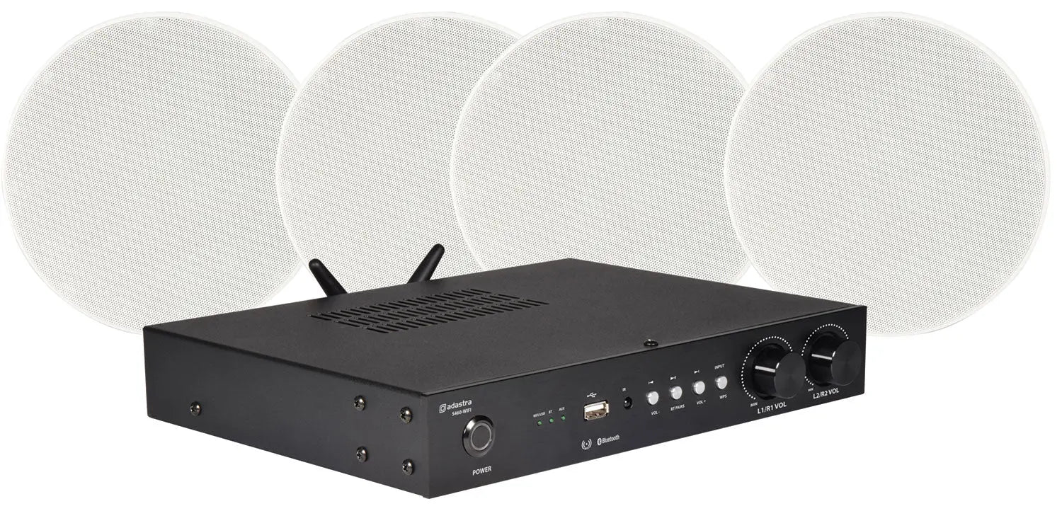 Want wireless audio streaming options? Control your ceiling speakers from an Android or iOS smart phone with freely available apps to stream music and podcasts directly from a WiFi network. This solution is ideal for larger rooms, reception areas, bars and cafes. Available in 2, 4 or 6 zone versions.Amplifier and speakers packed separately