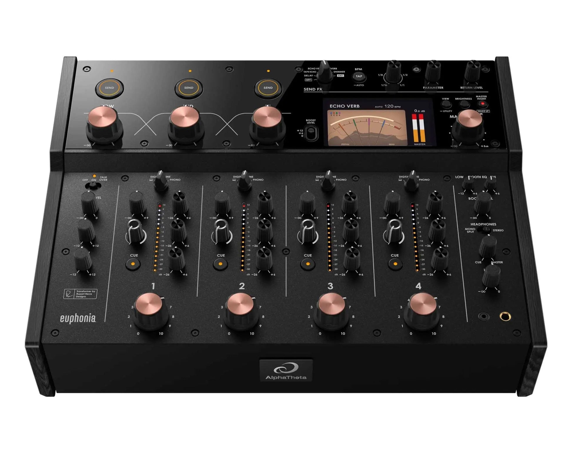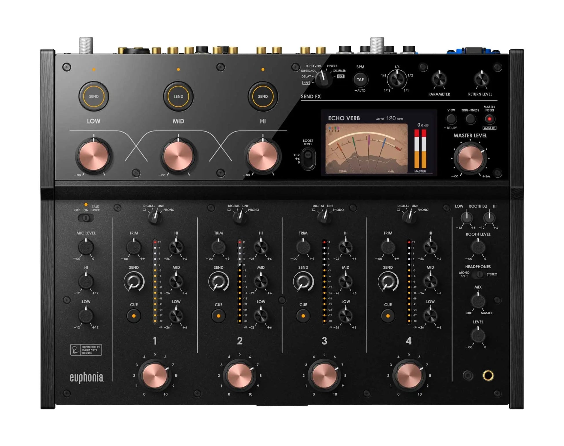 The AlphaTheta euphonia Rotary DJ Mixer is a premium 4-channel mixer crafted for professional DJs who demand nothing but the best in sound quality and precise control. Developed in collaboration with the legendary Rupert Neve Designs, the euphonia boasts custom-designed analog circuitry and top-tier components to deliver an unparalleled audio experience. With its intuitive layout and versatile connectivity, it stands as the perfect core for any DJ setup, whether you're playing in intimate clubs or at large-scale festivals.