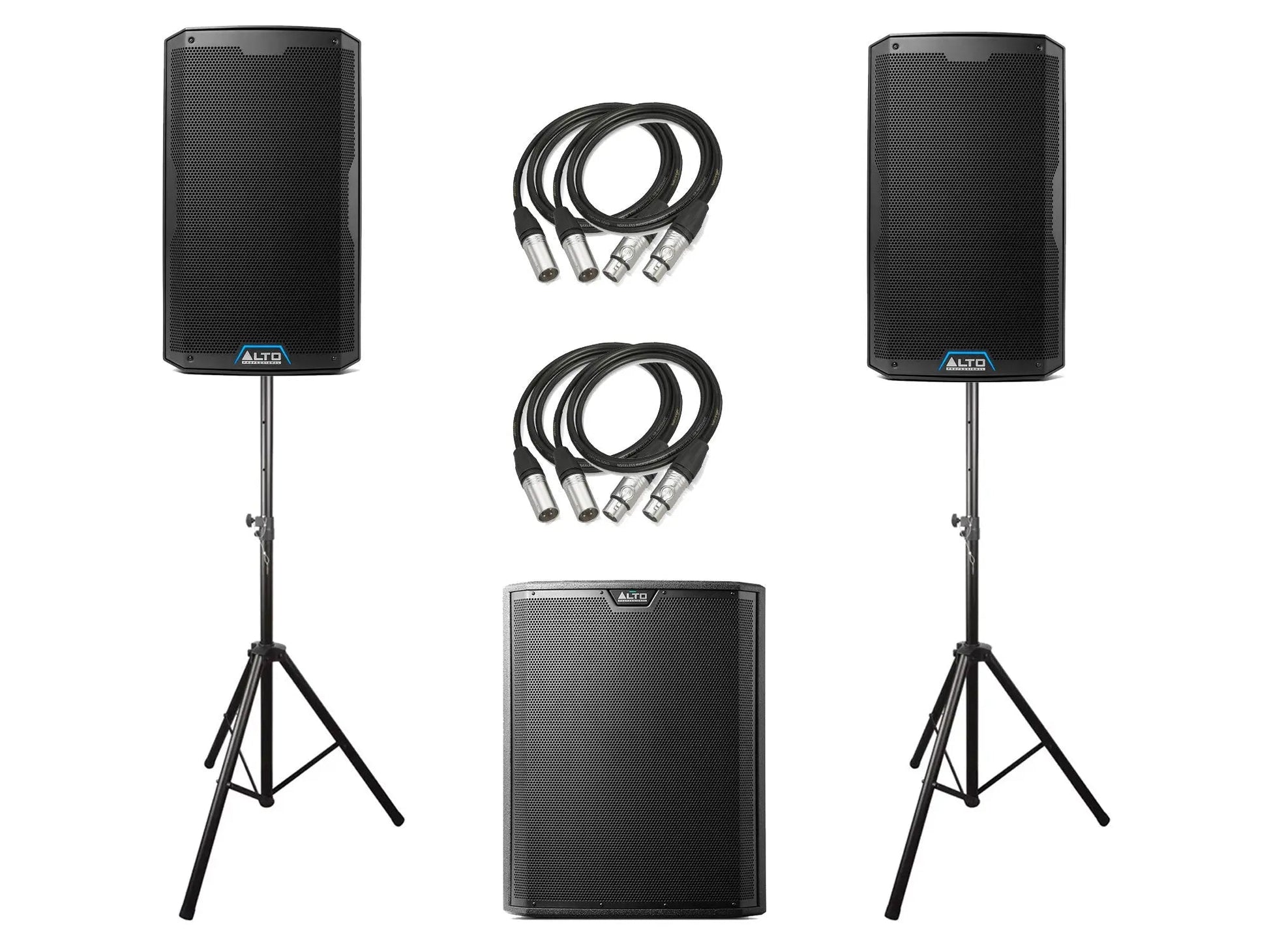 Elevate your sound with the Alto TS412 & TS18s PA Bundle 1, a comprehensive sound reinforcement package designed to deliver powerful, clear, and thunderous audio for DJs, live performers, and events. This bundle features a pair of high-performance Alto TS412 active full-range loudspeakers matched with a commanding Alto TS18s active subwoofer, providing a full-spectrum audio solution. Complete with essential speaker stands and connecting XLR cables, this bundle offers exceptional performance, versatile control, and robust build quality, ensuring a professional sound experience for any demanding application.