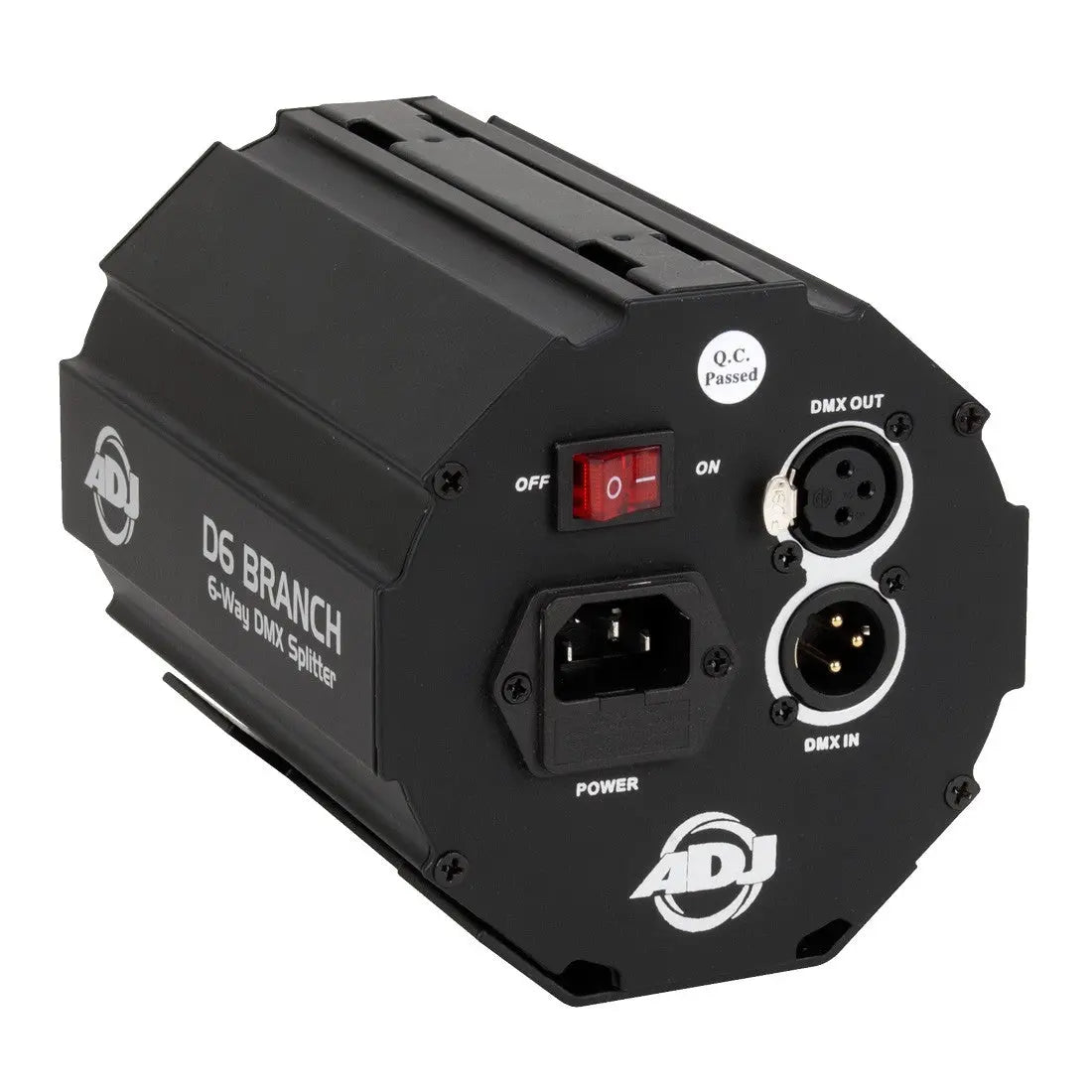 The D6-Branch is a 6-way DMX-Splitter that can be directly mounted onto truss with its integrated Velcros or by clamp. - 6-way DMX SplitterBooster - Can be mounted directly onto truss - 1 x 3-pin DMX InOut on the Front - 6 x 3-pin DMX Out on the rear side - IEC power connector - OnOff Switch