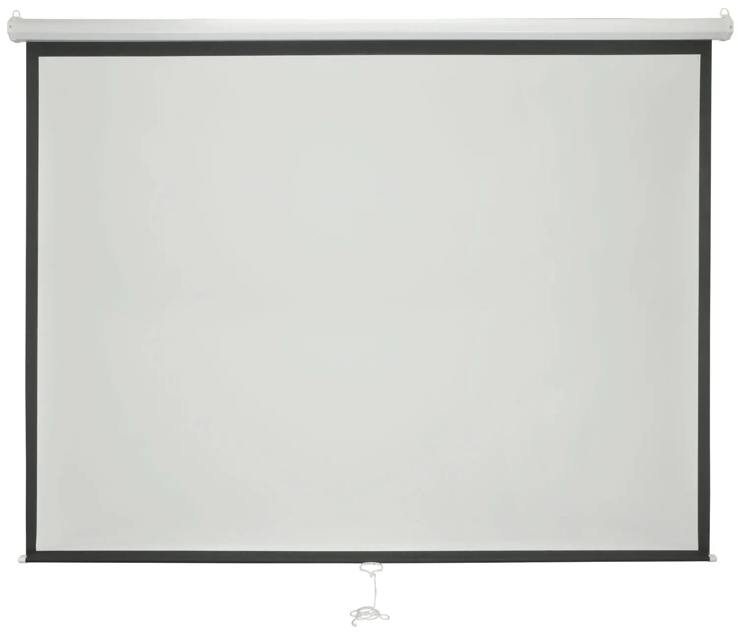 A range of manually operated large format projector screens. The screen can be pulled down to the desired level and set by the auto lock function. When not in use the screen will retract back into the housing smoothly when the lock is released via the integral spring mechanism. The screen is housed in a white steel case with mounting brackets on either end, allowing installation onto ceilings or walls. The screen itself has a weighted bottom bar to prevent the screen jamming in the case or curling. Various sizes available for all types of installation such as classrooms, auditoriums or places of worship.Flame retardant and mildew proof
