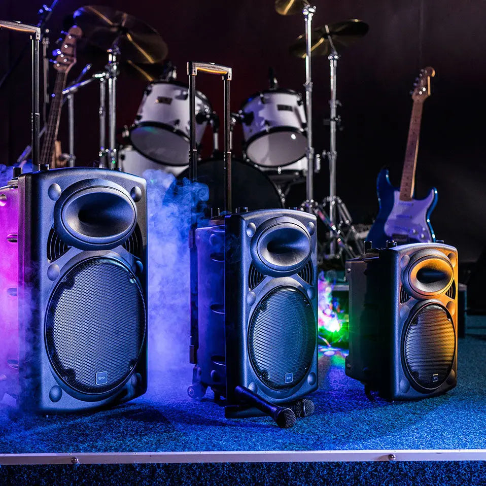A compact, trolley-style wheeled portable PA unit with a top-mounted retractable pull handle and side-mounted carry handle.   Versatile input options include 2 VHF wireless microphones (included), 2 further mic inputs (one can also be used for guitar), mini jack (for phones, tablets, laptops and mp3 players), and RCA in/out (ideal for DJs).   An internal media player works directly from SD card or USB memory stick, and a switchable VCV ‘voiceover’ feature automatically lowers the volume of background music when the mics are used.   A 35mm pole mount enables the unit to be used on a stand.   Mains or internal battery power (up to 8 hours).Echo effect for microphones
