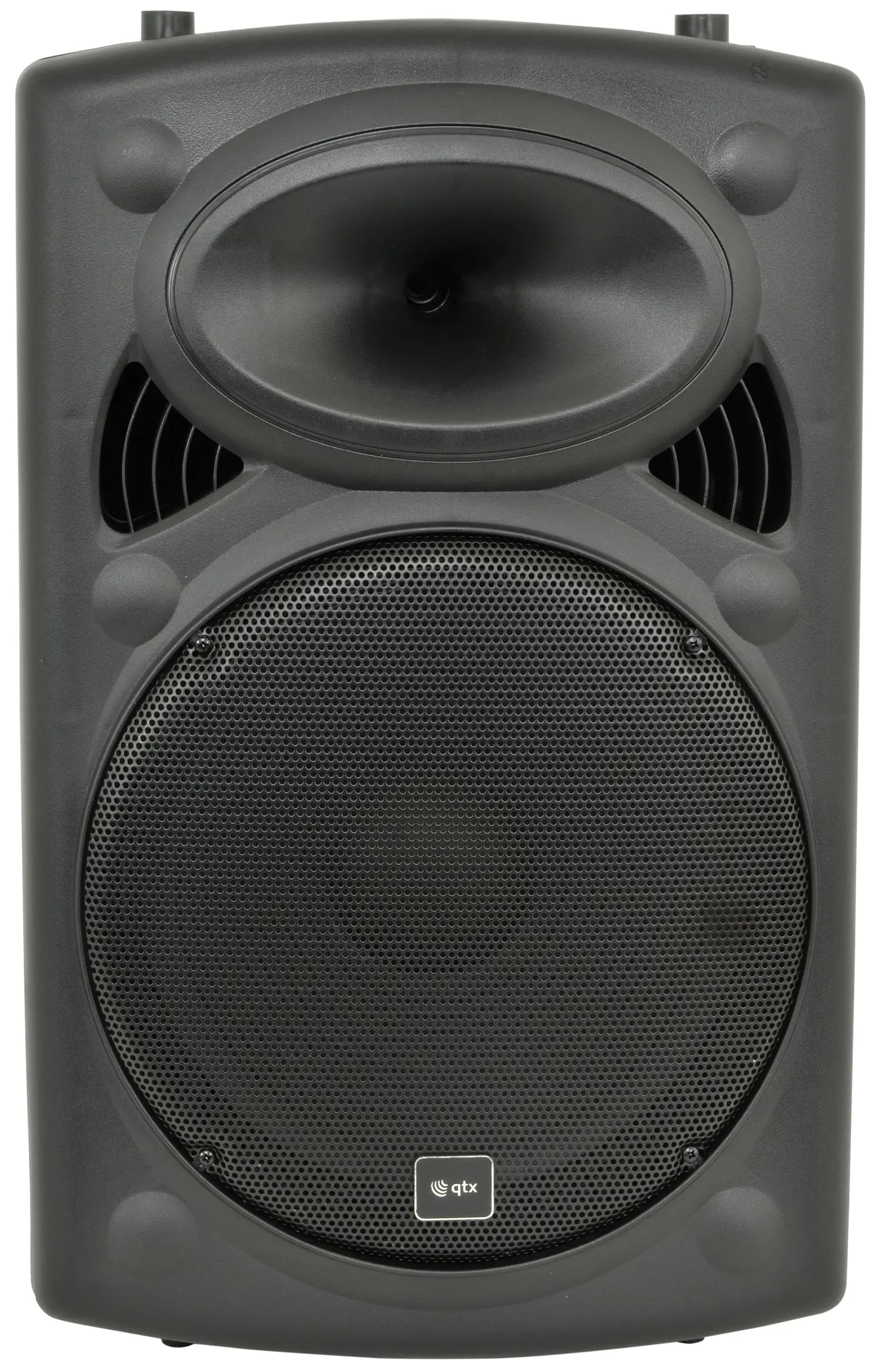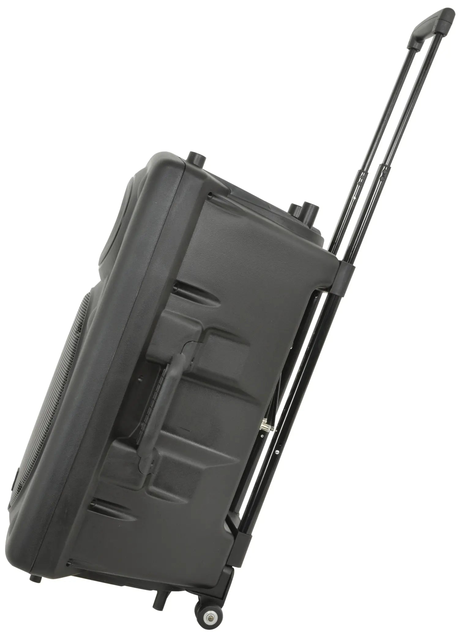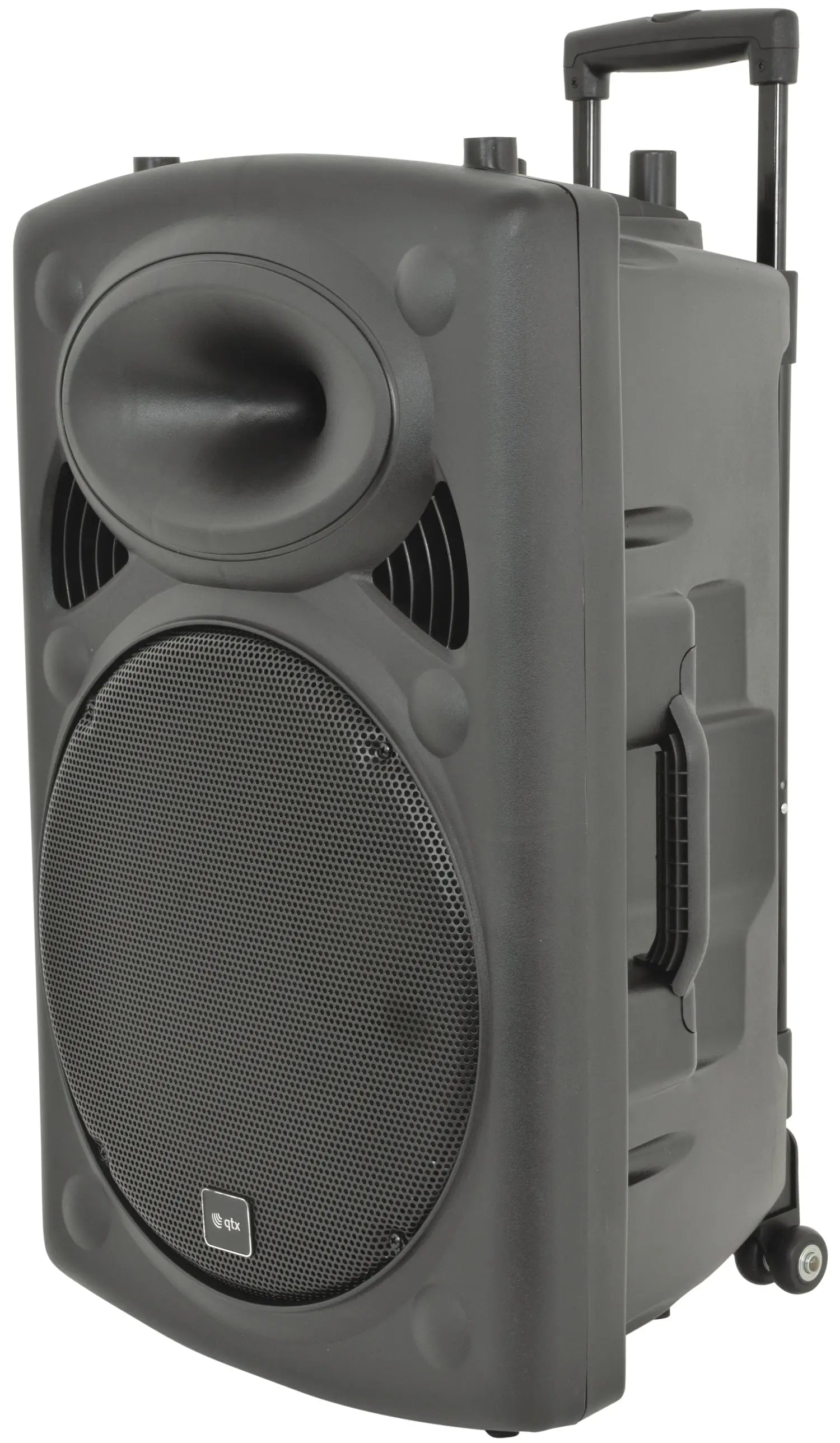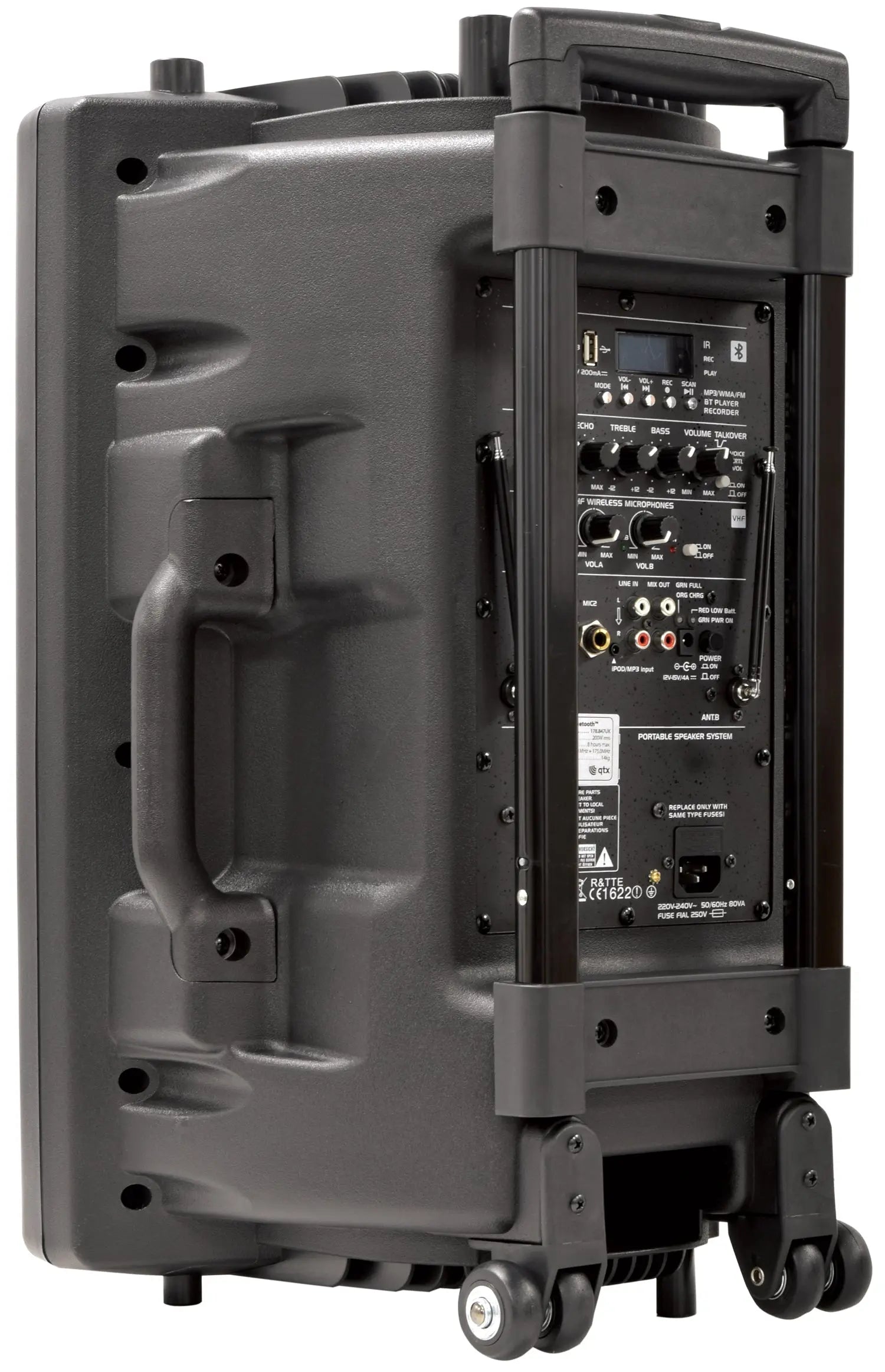 Compact portable PA unit based on the QR speaker cabinet. Built-in amplifier operating from mains or internal rechargeable battery powering a main driver and compression driven horn unit. Two VHF handheld wireless microphones are included (one on 8” and 10” versions) with the receiver built into the mixer/amp section at the rear along with a further two wired mic inputs, auxiliary line input and integral USB/SD/FM media player with record function. A B/T receiver is also built into the media player to enable pairing with a smartphone or tablet for wireless audio playback. A retractable trolley handle and rear wheels provide easy portability.VHF handheld microphone included