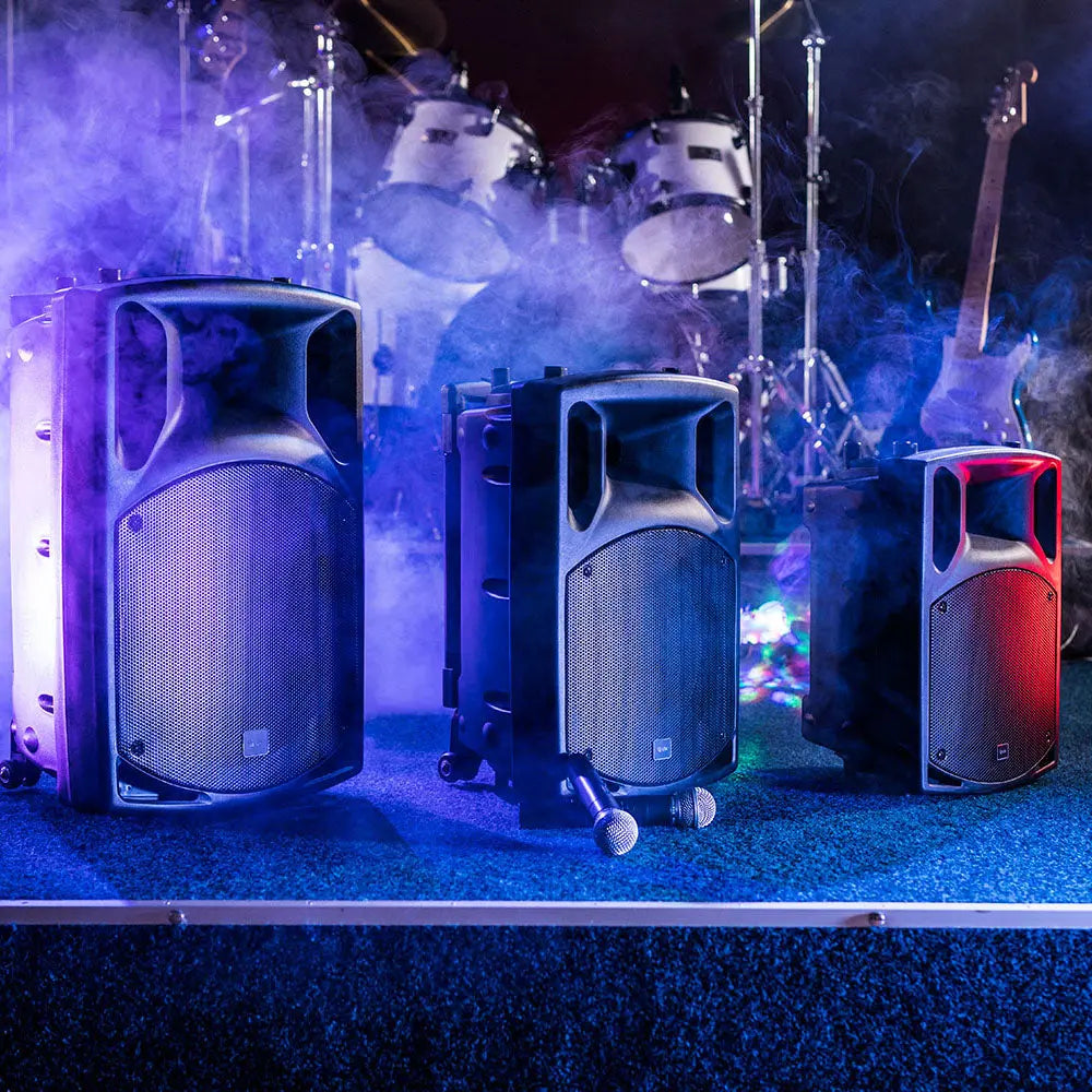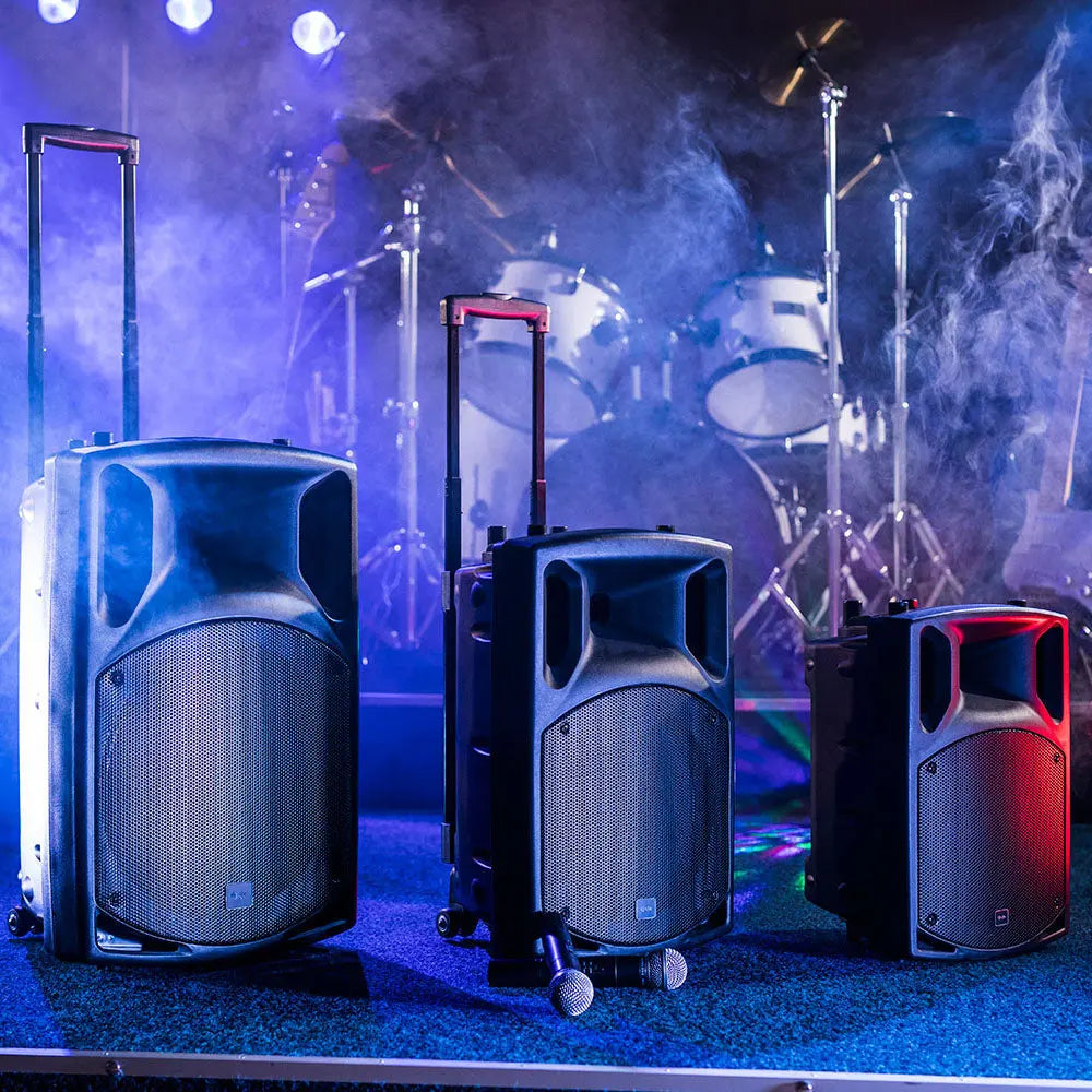 Complete portable PA unit in a QX-series cabinet. Built-in amplifier operating from mains or internal rechargeable battery powering a main 15" driver and compression driven horn unit. 2 x VHF handheld wireless microphones are included with the receiver built into the rear panel along with 2 further mic inputs auxiliary line input and Bluetooth receiver. Internal audio source is provided by an integral USBSDFM media player. A moulded handle and pole mount are included and a retractable trolley handle and rear wheels provide easy portability.