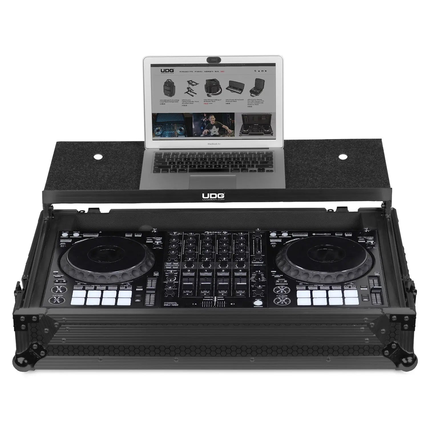UDG have further fined-tuned already a great design concept of their flight case into one specially for the most discerning DJproducer. Constructed from solid 9mm thick plywood the outside is laminated in a black finished honeycombhexagonal Stage Grip pattern. The inner sides are protected with high density diamond embossed EVA foam protective padding. This extremely robust padding protects the equipment against scratches dust or other damages creating a unique stylish practical finish.Ā Extra wide black finished aluminum profile massive UDG logo embossed ball corners are incorporated to ensures longevity maintaining a permanently attractive professional design. In addition in the UDG Ultimate Flight Case Pioneer DDJ-1000 Black Plus (Laptop Shelf + Wheels) there is an extra notebook shelf included for your notebook mouse andor any other devices such as effect processor and interfaces. This flight case also feature built-in corner wheels on one side for convenient transport and heavy duty spring loaded handles for a secured lift load. UDG Ultimate Flight Case Pioneer DDJ-1000 Black Plus (Laptop Shelf + Wheels) not only transport your complete set up easily securely but also facilitates devices to be setup within minutes. With these premium features incoporated the UDG Ultimate Flight cases provide premium professional quality in a very stylish modern black colored combination.