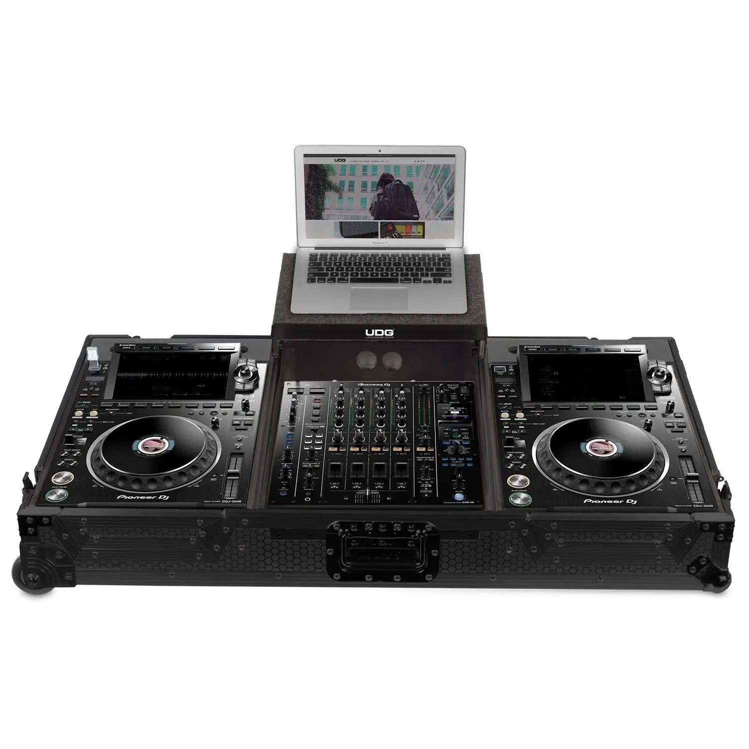 UDG Ultimate Flight Case Set Pioneer CDJ-3000A9 Black Plus (Laptop Shelf + Wheels) not only transport your complete set up easily securely but also facilitates devices to be setup within minutes. With these premium features incorporated the UDG Ultimate Flight cases provide premium professional quality in a very stylish modern black colored combination. Ā UDG have further fined-tuned already a great design concept of their flight case into one specially for the most discerning DJproducer. Constructed from solid 9mm thick plywood the outside is laminated in a black finished honeycombhexagonal Stage Grip pattern. The inner sides are protected with high density diamond embossed EVA foam protective padding. This extremely robust padding protects the equipment against scratches dust or other damages creating a unique stylish practical finish. Extra wide black finished aluminum profile massive UDG logo embossed ball corners are incorporated to ensures longevity maintaining a permanently attractive professional design. The UDG Ultimate Flight Case Set Pioneer CDJ-3000A9 Black Plus (Laptop Shelf + Wheels) also features built-in corner wheels with high quality in-line skate bearings for convenient transport and heavy duty spring loaded handles for a secured lift load. In addition there is an extra notebook shelf included for your notebook mouse andor any other devices such as effect processor and interfaces. UDG Ultimate Flight Case Set Pioneer CDJ-3000A9 Black Plus (Laptop Shelf + Wheels) not only transport your complete set up easily securely but also facilitates devices to be setup within minutes. With these premium features incorporated the UDG Ultimate Flight cases provide premium professional quality in a very stylish modern black colored combination. Ā