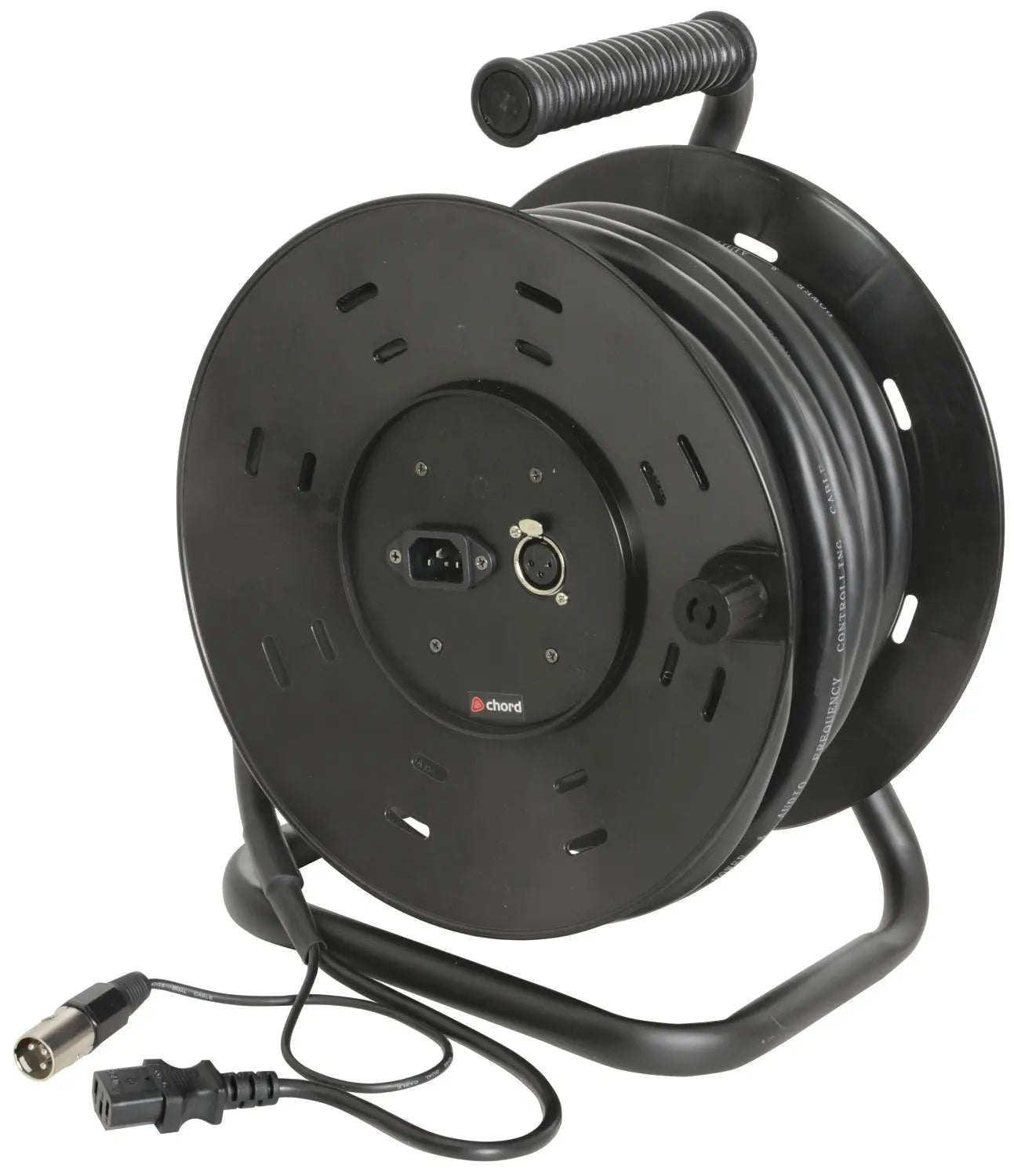 A sturdy reel loaded with an IEC power lead (MF sockets) and an XLR lead (MF) so power and audio can be laid out simultaneously. Ideal for use with active speakers.Screened cable Tubular metal framestand Integral carry handle and winder XLRIEC sockets on drum and plugs on trailing tails